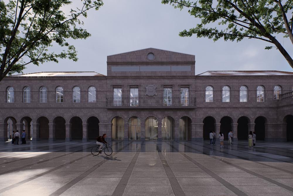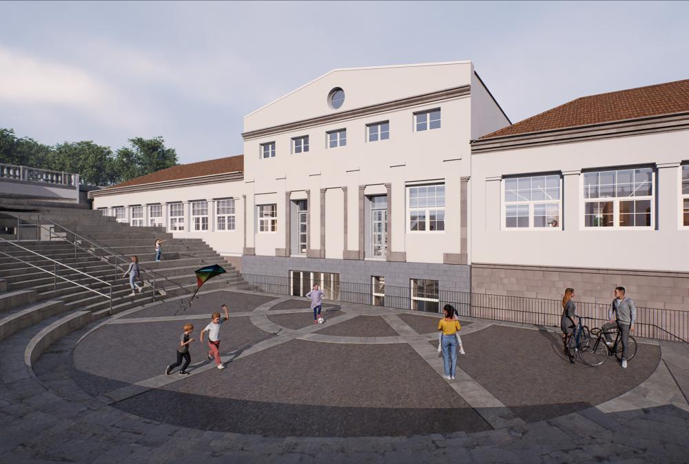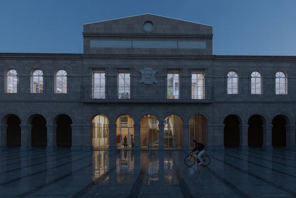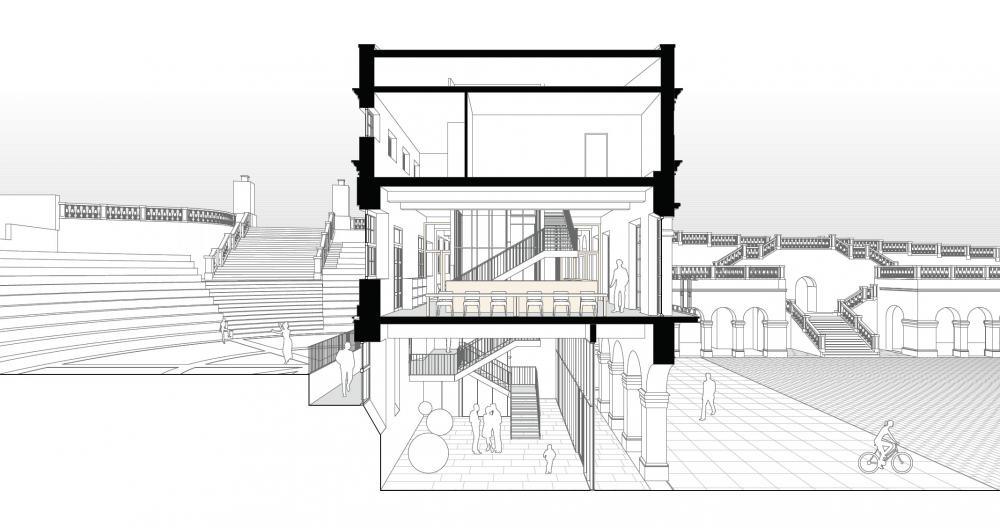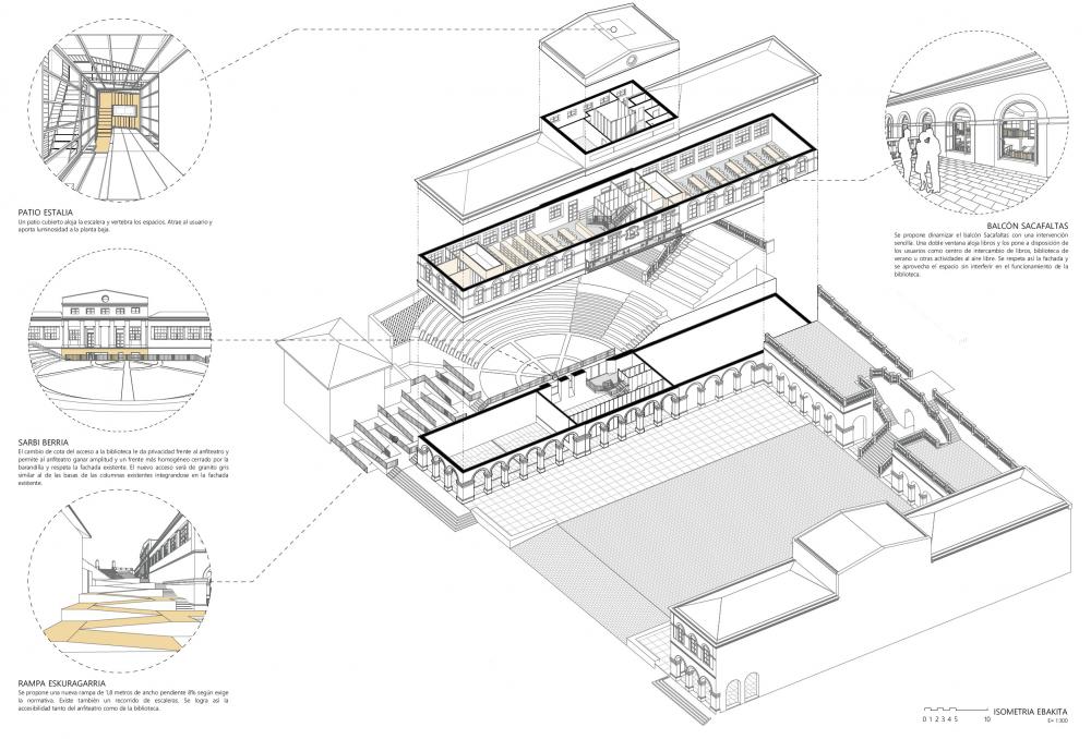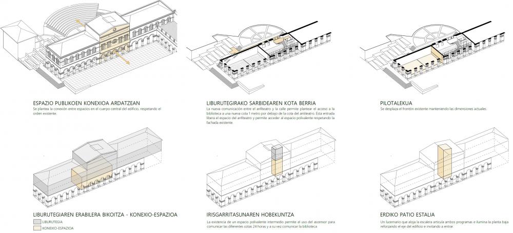 El edificio de las Escuelas Públicas que aloja la biblioteca se integra en un tejido urbano de notable complejidad. La topografía accidentada actúa como barrera entre la plaza Pasealeku, el anfiteatro y el edificio de las antiguas Escuelas Públicas. Además, la diferencia de cota entre el anfiteatro y la plaza dificulta su conexión directa. La propuesta plantea superar estas discontinuidades mediante la creación de una relación fluida entre ambos espacios públicos. El objetivo es conformar un ámbito abierto, permeable y acogedor, donde la ciudadanía pueda encontrarse y reconocerse en comunidad. Para alcanzar este objetivo se proyecta un edificio de carácter dual. Un espacio polivalente actúa como antesala de la biblioteca y articula la conexión entre los distintos espacios públicos. De este modo, se garantiza la autonomía funcional de cada ámbito y se posibilita una accesibilidad continua entre la plaza y el anfiteatro, las 24 horas, sin interferir en el funcionamiento de la biblioteca.
