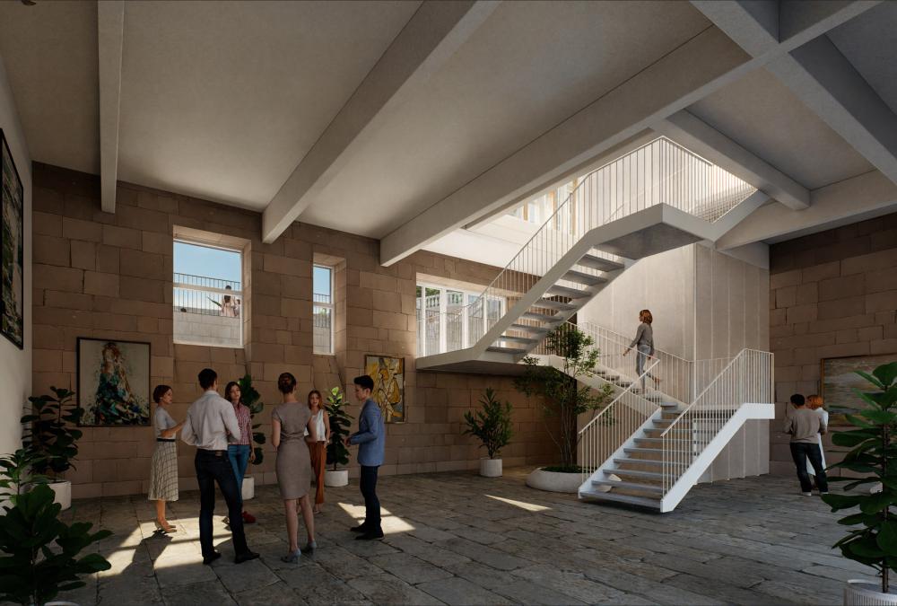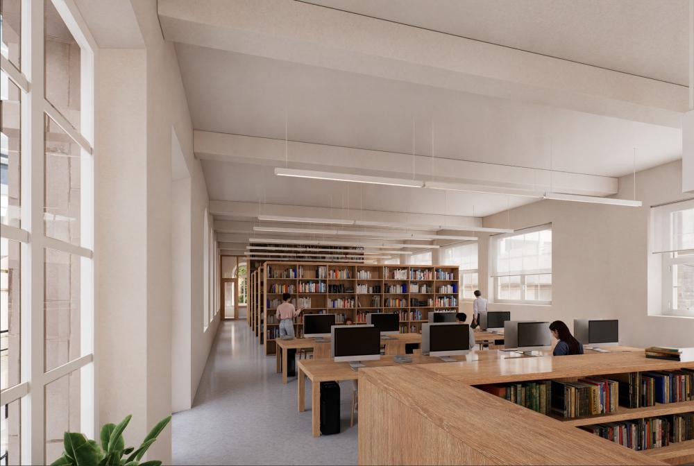 Se propone una nueva rampa que conecta directamente el anfiteatro con la calle. Este acceso se concibe como una oportunidad para replantear la entrada a la biblioteca desde el propio anfiteatro. Se elimina el acceso actual, elevado sobre el nivel del escenario, y se plantea uno a una cota 1 metro inferior, con el fin de ampliar el espacio del anfiteatro, garantizar la accesibilidad universal y respetar la fachada histórica de las Escuelas Públicas. Un nuevo nivel intermedio, situado entre la planta baja y la primera, actúa como distribuidor. Desde este espacio, un ascensor comunica de forma accesible todos los niveles del edificio. La independencia entre el área de acceso y la biblioteca permite que el ascensor pueda utilizarse de manera autónoma las 24 horas, sin condicionar el funcionamiento interno de la biblioteca.