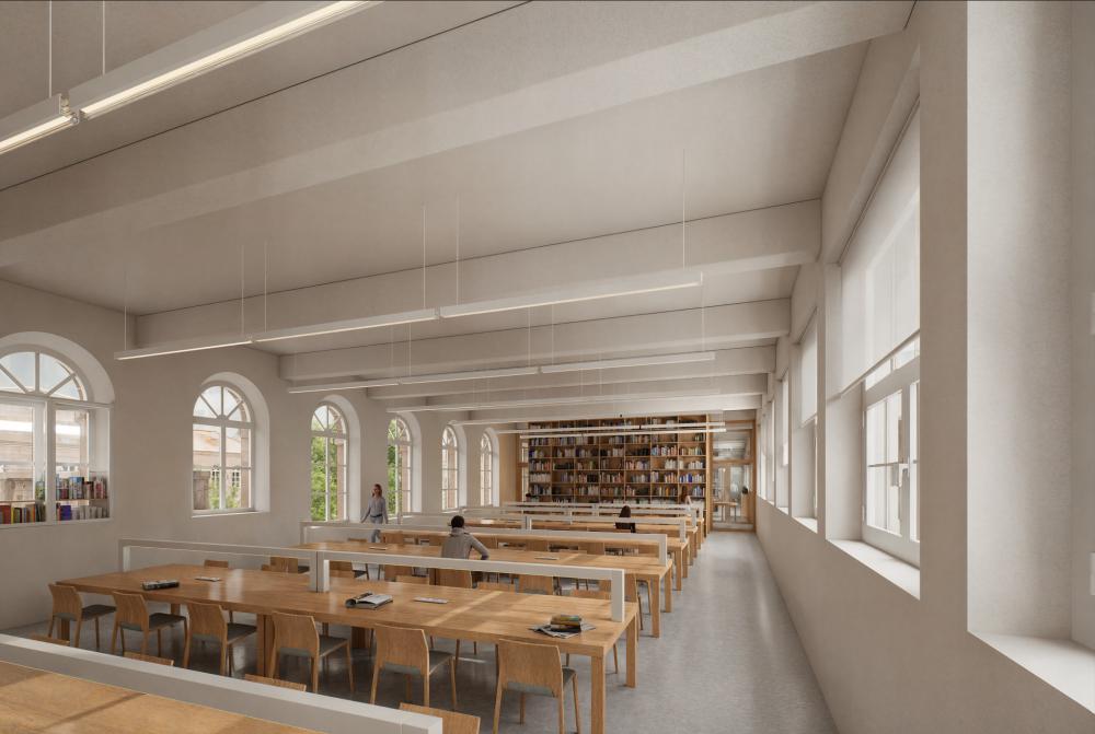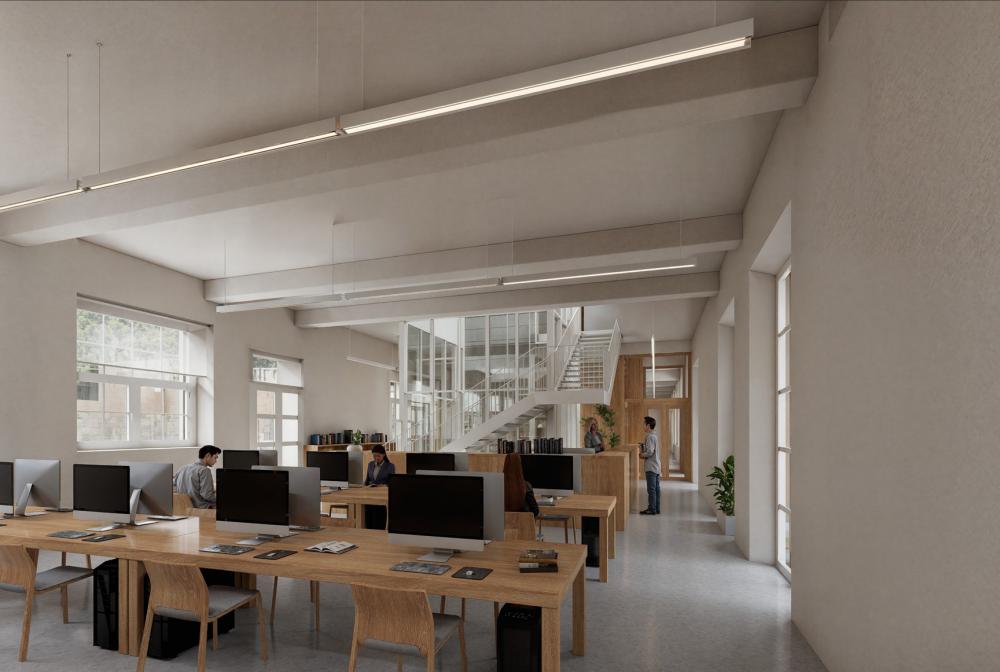 El espacio de conexión se concibe como un lugar de reunión abierto, flexible y configurable, capaz de acoger diversas actividades: desde exposiciones, bertsolaritz o reuniones. Su independencia respecto a la biblioteca garantiza que su uso no interfiera en las actividades propias de ésta. El espacio se completa con un aseo en planta baja, asegurando su autonomía funcional. La biblioteca se desarrolla en las plantas superiores del edificio. La primera planta concentra los usos públicos, incluyendo la sala de lectura, diseñada para poder funcionar de manera independiente y con horario ampliado. La segunda planta alberga los espacios destinados al personal y a la gestión del equipamiento.